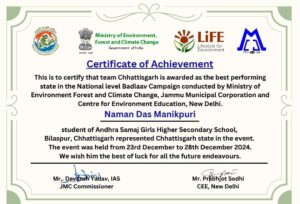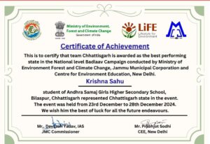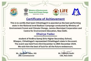 आंध्रा समाज द्वारा संचालित आंध्रा समाज कन्या ऊ मा विद्यालय रेलवे परिक्षेत्र बिलासपुर के बच्चे के द्वारा पर्यावरण व जलवायु परिवर्तन को लेकर लोगो को जागरूक करने राष्ट्रिय स्तर पर कई क्रार्यक्रम हो रहे है इसी कड़ी में जम्मू कश्मीर के जम्मू शहर में दिनांक 23 दिसंबर से 28 दिसंबर 2024 तक कार्यक्रम आयोजित किया गया