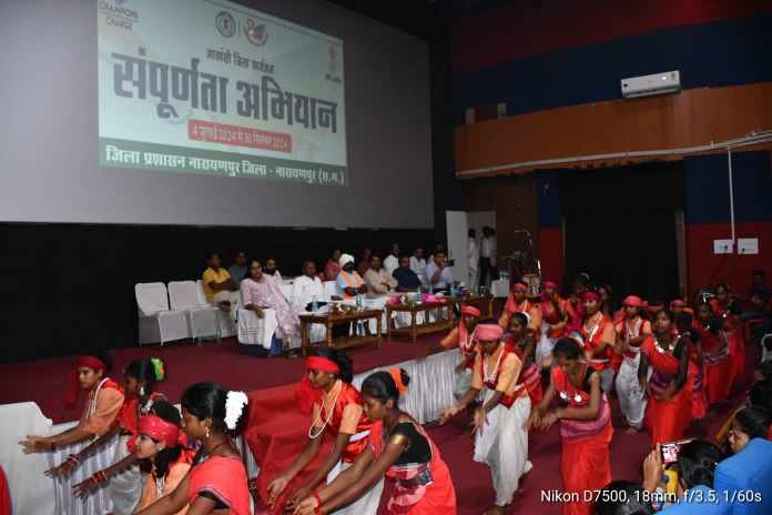 नारायणपुर ,आकांक्षी जिला कार्यक्रम के तहत “सम्पूर्णता अभियान नीति आयोग अंतर्गत आकांक्षी जिला कार्यक्रम के तहत “सम्पूर्णता अभियान उत्सव” का सिनेमा हॉल नारायणपुर एवं ओरछा मुख्यालय में शुभारंभ किया गया। कार्यक्रम के मुख्य अतिथि सर्व आदिवासी समाज के संरक्षक रुपसाय सलाम एवं कार्यक्रम की अध्यक्षता कलेक्टर बिपिन मांझी ने किया | कार्यक्रम के मुख्य अतिथि सर्व आदिवासी समाज के संरक्षक रूपसाय सलाम ने संबोधित करते हुए कहा कि देश को विकसित बनाने के लिए सबसे पहले समाज को सुधारने की आवश्यकता है तभी देश भी विकसित हो सकेगा | सबसे पहले सोच बदलने की आवश्यकता है तभी हमारे समाज आगे बढ़ेगा और नारायणपुर क्षेत्र में विकास की गंगा बहने लगेगा | उन्होंने कहा कि सीखने की कोई आयु नहीं होती मैं अभी भी सीखने का भरपूर प्रयास कर रहा हूं | उन्होंने संपूर्णता अभियान को सफल बनाने के लिए उपस्थित गणमान्य नागरिकों और अधिकारियों से अपील की |