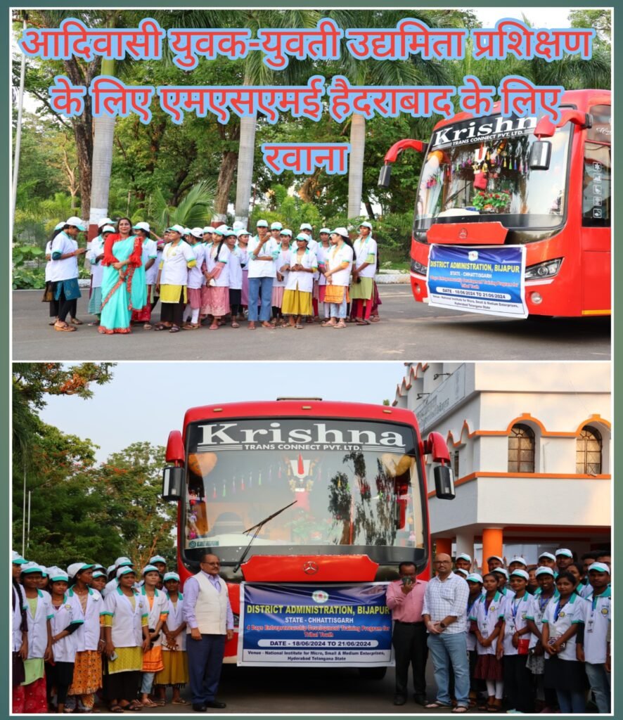 बीजापुर 18 जून 2024- जिला प्रशासन के अभिनव पहल पर स्थानीय आदिवासी युवक-युवतियों को प्रथम पीढ़ी के उद्यमी बनाने के उद्देश्य से 10 दिवसीय प्रशिक्षण की व्यवस्था जिला प्रशासन द्वारा की गई जिसके अर्न्तगत 6 दिवसीय प्रशिक्षण आरसेटी बीजापुर में पूर्ण होने के पश्चात 04 दिवसीय प्रशिक्षण हेतु नेशनल इंस्टीट्यूट फॉर माइक्रो स्मॉल एण्ड मिडियम इंटर प्राईजेस हैदराबाद के लिए कलेक्टर अनुराग पाण्डेय ने प्रशिक्षु युवा-युवतियों से भरे बस को हरी झंडी दिखाकर रवाना किया। इस प्रशिक्षण में 35 प्रशिक्षु शामिल हो रहे हैं।