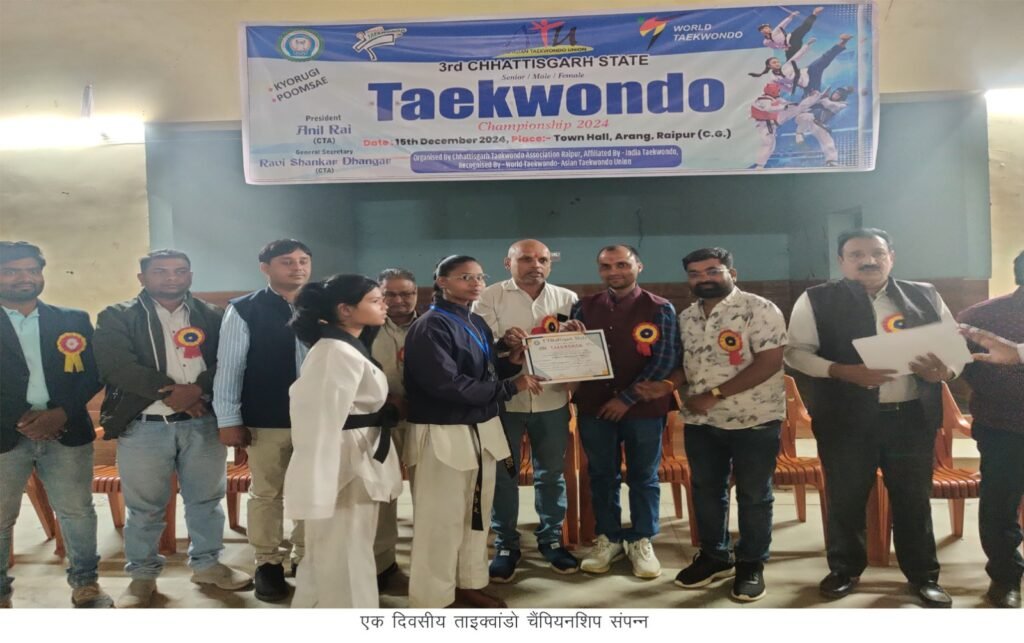 आरंगः आरंग में अयोजित एक दिवसीय 3री सिनियर महिला-पुरुष ओपन राज्य स्तरीय ताइक्वांडो चैंपियनशिप का शुभारंभ छत्तीसगढ़ ताइक्वांडो संघ सचिव रवि धनगर, छत्तीसगढ़ सॉफ्ट टेनिस संघ सचिव प्रमोद ठाकुर, टेक्निकल एडवाइजर दिलीप विश्वकर्मा, आरंग युवा एवं खेल संगठन अध्यक्ष अमन साहू द्वारा सरस्वती माता के छायाचित्र का पूजा अर्चना कर किया गया। प्रतियोगिता में पूरे प्रदेश के 20 जिलों से 70 खिलाड़ियों ने भाग लिया। प्रतियोगिता के विजेता खिलाड़ी महिला 46 किलो वर्ग प्रथम रिया कश्यप, द्वितीय सादिया कुरैशी, तृतीय रितु निषाद, 49 किलो वर्ग प्रथम अंजली नागे, द्वितीय खोगेश्वरी, तृतीय विजया लक्ष्मी, 53 किलो वर्ग प्रथम जसिंता, द्वितीय अपूर्वा, तृतीय ज्ञानेश्वरी, 57 किलो वर्ग प्रथम चंचल, द्वितीय दीपेश्वरी, 63 किलो वर्ग प्रथम योगिता चैधरी, पुरुष 54 किलो वर्ग प्रथम सावंत, द्वितीय तेज कुमार, तृतीय रौनक, 58 किलो वर्ग प्रथम हर्षनाथ, द्वितीय सुख कुमार, तृतीय टिकेश्वर, 63 किलो वर्ग प्रथम कुशकुमार, द्वितीय प्रदीप, तृतीय चिरंजीव, 68 किलो वर्ग प्रथम स्वजित, द्वितीय कमलेश, तृतीय बलराम कुमार, 74 किलो वर्ग प्रथम शिवराज, द्वितीय देव कुमार, तृतीय अनिल यादव, 80 किलो वर्ग प्रथम बीएसएफ, द्वितीय प्रिंस कुमार, 80किलो से उपर प्रथम गुलाम मोहम्मद, द्वितीय ओम साहू रहे।