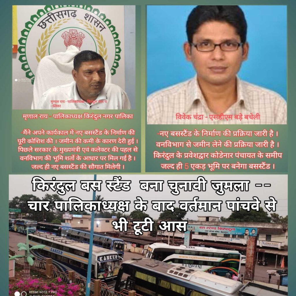 तृतीय पालिकाध्यक्ष रहे शैलेंद्र सिंह एवं वर्ष 2014 से 2019 तक चतुर्थ पालिकाध्यक्ष रही राजी मोल एवं वर्ष 2019 से वर्तमान पालिकाध्यक्ष के पद को सुशोभित कर रहे मृणाल राय की कहानी एक जैसी ही है । सभी पालिकाध्यक्ष ने सिर्फ किरंदुल नगर वासियों की बहुप्रतीक्षित मांग बस स्टैंड के नवनिर्माण को सिर्फ चुनावी जुमला ही बनाया ।