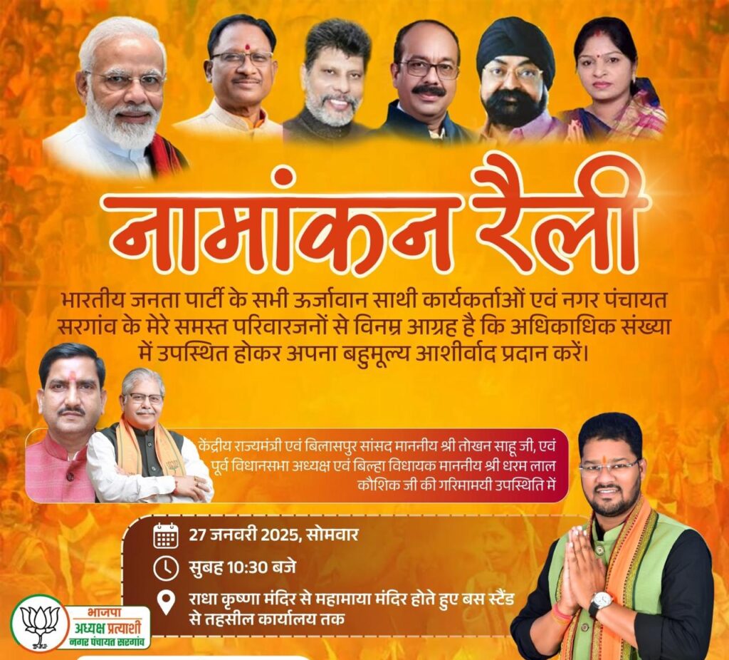 नगर पंचायत सरगांव में भारतीय जनता पार्टी के अध्यक्ष प्रत्याशी परमानंद साहू की नामांकन रैली का आयोजन 27 जनवरी 2025 (सोमवार) को सुबह 10:30 बजे किया जाएगा। इस रैली में भाजपा कार्यकर्ता, समर्थक और नगर पंचायत सरगांव के नागरिक भारी संख्या में उपस्थित होंगे। रैली का मार्ग राधा कृष्णा मंदिर से महामाया मंदिर होते हुए बस स्टैंड और तहसील कार्यालय तक रहेगा।