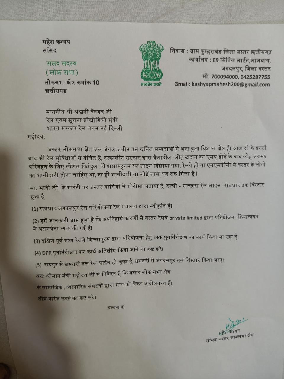 दंतेवाड़ा — बस्तर सांसद महेश कश्यप ने रेल एवम सूचना प्रौद्योगिकी केंद्रीय मंत्री अश्वनी वैष्णव से मुलाकात कर बस्तर के रेल संबंधित विभिन्न मुद्दों से अवगत कराया | कश्यप ने ज्ञापन में उल्लेखित किया की बस्तर लोकसभा क्षेत्र जल जंगल जमीन वन खनिज सम्पदाओं से भरा हुआ विशाल क्षेत्र है। आजादी के बरसों बाद भी रेल सुविधाओं से वंचित है,तत्कालीन सरकार द्वारा बैलाडीला लोह खदान का एमयू होने के बाद लोह अयस्क परिवहन के लिए स्पेशल किरंदुल विशाखापट्टनम रेल लाइन बिछाया गया,रेलवे हो या एनएमडीसी से बस्तर के लोगो का भागीदारी होना चाहिए था,ना ही भागीदारी ना कोई विशेष लाभ अब तक मिला है l प्रधानमंत्री नरेंद्र मोदी के गारंटी पर बस्तर वासियों ने भरोसा जताया हैं, दल्ली – राजहरा रेल लाइन का रावघाट तक विस्तार हुआ है | रावघाट जगदलपुर रेल परियोजना रेल मंत्रालय द्वारा स्वीकृत है,हमें जानकारी प्राप्त हुआ है कि अपरिहार्य कारणों से बस्तर रेलवे द्वारा परियोजना क्रियान्वयन में असमर्थता व्यक्त की गई है,दक्षिण पूर्व मध्य रेलवे विल्लापुरम द्वारा परियोजना हेतु डी पी आर पुनर्निरीक्षण का कार्य किया जा रहा है।डी पी आर पुनर्निरीक्षण कर कार्य अतिशीघ्र किया जाने का कष्ट करे। कश्यप ने कहा की रायपुर से धमतरी तक रेल लाईन का विस्तार हो चुका है,धमतरी से जगदलपुर तक विस्तार किया जाना चाहिए ।बस्तर लोक सभा क्षेत्र