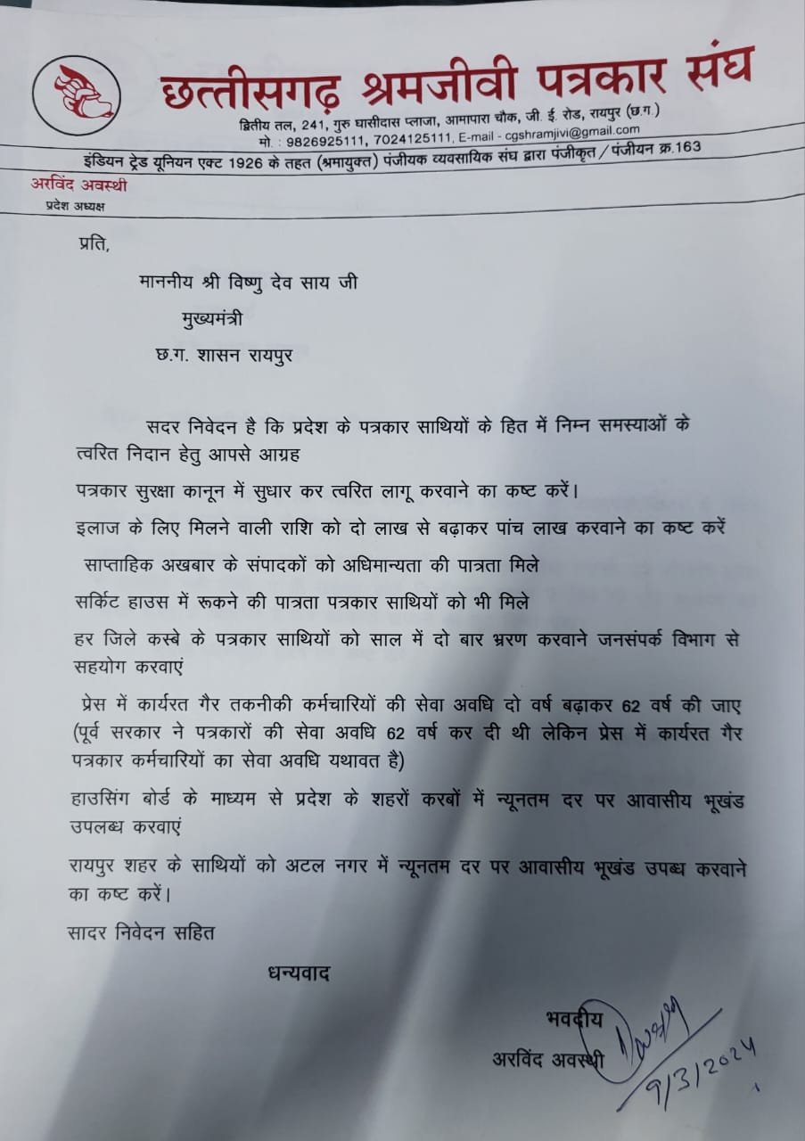 श्रमजीवी पत्रकार संघ के प्रदेश अध्यक्ष अरविंद अवस्थी जी ने मुख्यमंत्री साय से मुलाकात कर प्रदेश के पत्रकारों के हित के लिए निम्न समस्याओं के त्वरित निदान हेतु ज्ञापन देकर माननीय मुख्यमंत्री से आग्रह किया है