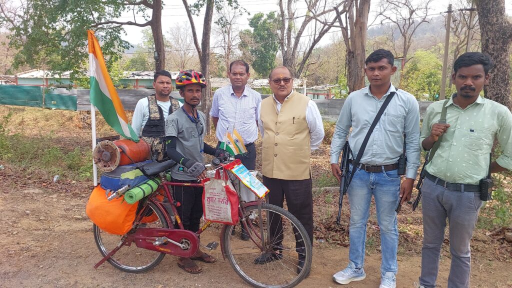 बीजापुर 15 अप्रैल 2024- बीजापुर से भोपालपटनम का दौरा करने के दौरान कलेक्टर अनुराग पाण्डेय की मुलाकात में भारत यात्रा पर निकले युवक लिंटन आकाश से हुई जिन्होने साईकिल यात्रा की शुरूआत असम से शुरू कर दो वर्षों तक भारत यात्रा करने का लक्ष्य रखा है। जल एवं पेड़, पर्यावरण संरक्षण के उद्देश्य से भारत यात्रा करने के दौरान रविवार को बीजापुर से राजप्पा आंध्रप्रदेश की यात्रा के दौरान मद्देड़ के समीप कलेक्टर ने युवक को मिलकर उनका उत्साहवर्धन एवं आर्थिक सहयोग किया। इस दौरान संयुक्त कलेक्टर कैलाश वर्मा उपस्थित थे।,,000