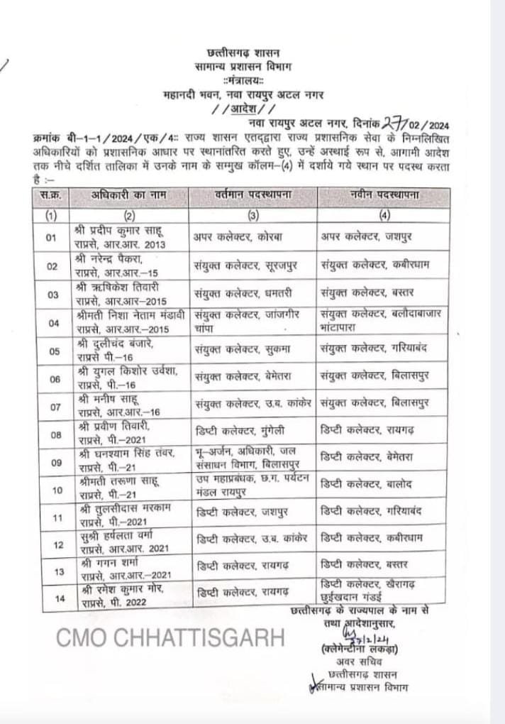 छत्तीसगढ़ शासन सामान्य प्रशासन विभाग द्वारा दिनाँक 27 फरवरी 2024 को आदेश क्रमांक बी-1-1/2024/एक/4 के तहत घरघोड़ा के अनुविभागीय अधिकारी का तबादला डिप्टी कलेक्टर के रूप में खैरागढ़ छुई खदान कर दिया गया है । परन्तु स्थानांतरित होने के बाद से आज 4माह 10 दिन बीत जाने के बाद भी साहब की रिलीविंग की कोई सुगबुगाहट नही नजर आ रही ऐसे में लोग दबी जबान से सवाल।करने में लगे है की आखिर किस विशेष आस में साहब रिलीविंग नही ले रहे या उन्हें रिलीव नही किया जा रहा ।