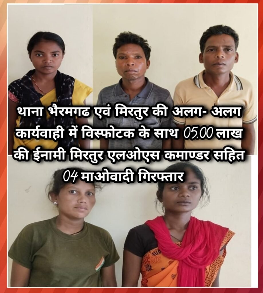 थाना भैरमगढ एवं मिरतुर की अलग- अलग कार्यवाही में विस्फोटक के साथ 05.00 लाख की ईनामी मिरतुर एलओएस कमाण्डर सहित 04 माओवादी गिरफ्तार