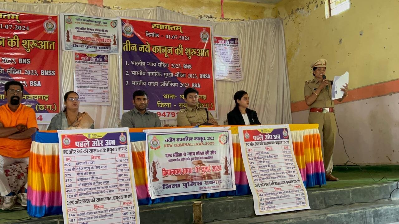 *01 जुलाई रायगढ़* । आज से नवीन कानून संहिताओं के तहत न्यायपालिका, पुलिस कार्यों का क्रियान्वयन करेगी । नवीन कानून लागू होने पर जिला पुलिस “क्रियान्वयन उत्सव” के रूप में मना रही है जिसका उद्देश्य लोगों को नवीन कानून की जानकारी देना और लोगों को उनके अधिकारों को बताना है । इसी परिपेक्ष्य में पुलिस सामुदायिक भवन, रायगढ़ में नवीन अपराधिक कानून पर आधारित क्रियान्वयन उत्सव कार्यक्रम का आयोजन जिला पुलिस द्वारा किया गया ।