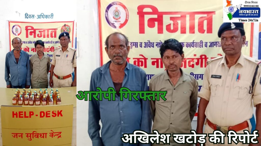 दिनाक 12.06.2024 को थाना सरस्वती नगर पुलिस को सूचना मिली की सतनामी पारा कोटा दो व्यक्ति शराब बिक्री करने रखे हैं सूचना पर हमराह स्टाफ के मौका पहुँच कर उक्त व्यक्ति को घेराबंदी कर पकड़ा गया नाम पता पूछने पर अपना 01. बंसी जांगड़े पिता सामरु जांगड़े उम्र 61 साल पता सतनामी पारा कोटा 02.विजय तांडी पिता स्वर्गीय दिलीप तांडी उम्र 43 साल न्यू लाइफ एसी के पास कुकुर बेडा थाना सरस्वती नगर रायपुर बताया उसके कब्ज़े से एक सफेद कलर की प्लास्टिक की बोरी में देसी मदिरा मसाला 35 पौवा कीमती 3850 रुपए को जप्त कर कब्जा पुलिस लिया गया आरोपी के विरुद्ध अपराध धारा सदर का पाए जाने से थाना सरस्वती नगर में अपराध क्रमांक 160/ 24 धारा 34(2) आबकारी एक्ट का अपराध पंजीबद्ध कर कार्यवाही किया गया