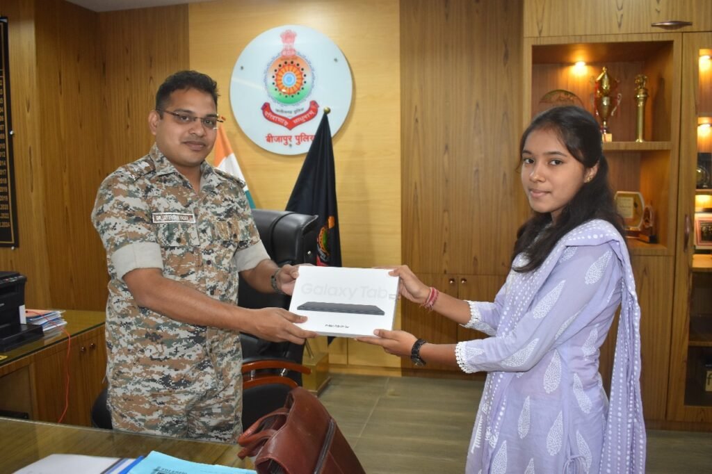 पुलिस अधीक्षक बीजापुर डॉ0 जितेन्द्र कुमार यादव ने बच्ची की इस सफलता पर बधाई देते हुए उनके उज्जवल भविष्य की कामना कर भेट स्वरूप टेबलेट प्रदान किया ।*