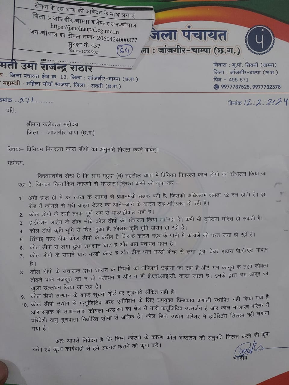 पर्यावरण को ठेंगा,, कोल डिपो से क्षेत्र वासियों को समस्या,,प्रीमियम मिनरल्स कोल डिपो की अनुमति निरस्त करने उमा राजेन्द्र राठौर ने किया कलेक्टर से शिकायत