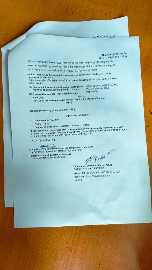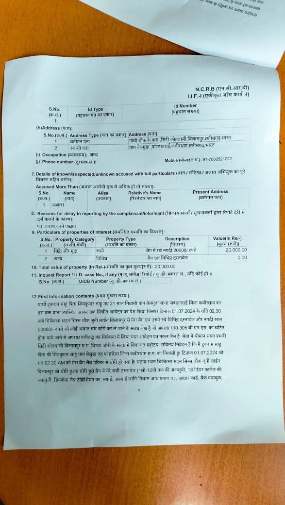 उक्त घटना दिनांक 01/07/2024 की जिसमे प्रार्थी टुकराम साहू की बैग चोरी हुई बैग में 20,000 रुपए नगद और विभिन्न दस्तावेज होने का रिपोर्ट दर्ज किया गया है प्रार्थी ने थाने में उपस्थित होकर 05/07/2024 को रिपोर्ट दर्ज कराई है पर मामला को अब तक पांडातराई थाना ने अब तक घटना को गंभीरता से नहीं ले रही है जिसके कारण चोर अब तक पुलिस के हाथ नहीं लग पाई है जबकि घटना में चोर ने बैग को चोरी करते सीसी टीवी फुटेज में स्पष्ट रूप से देखी जा रही है l