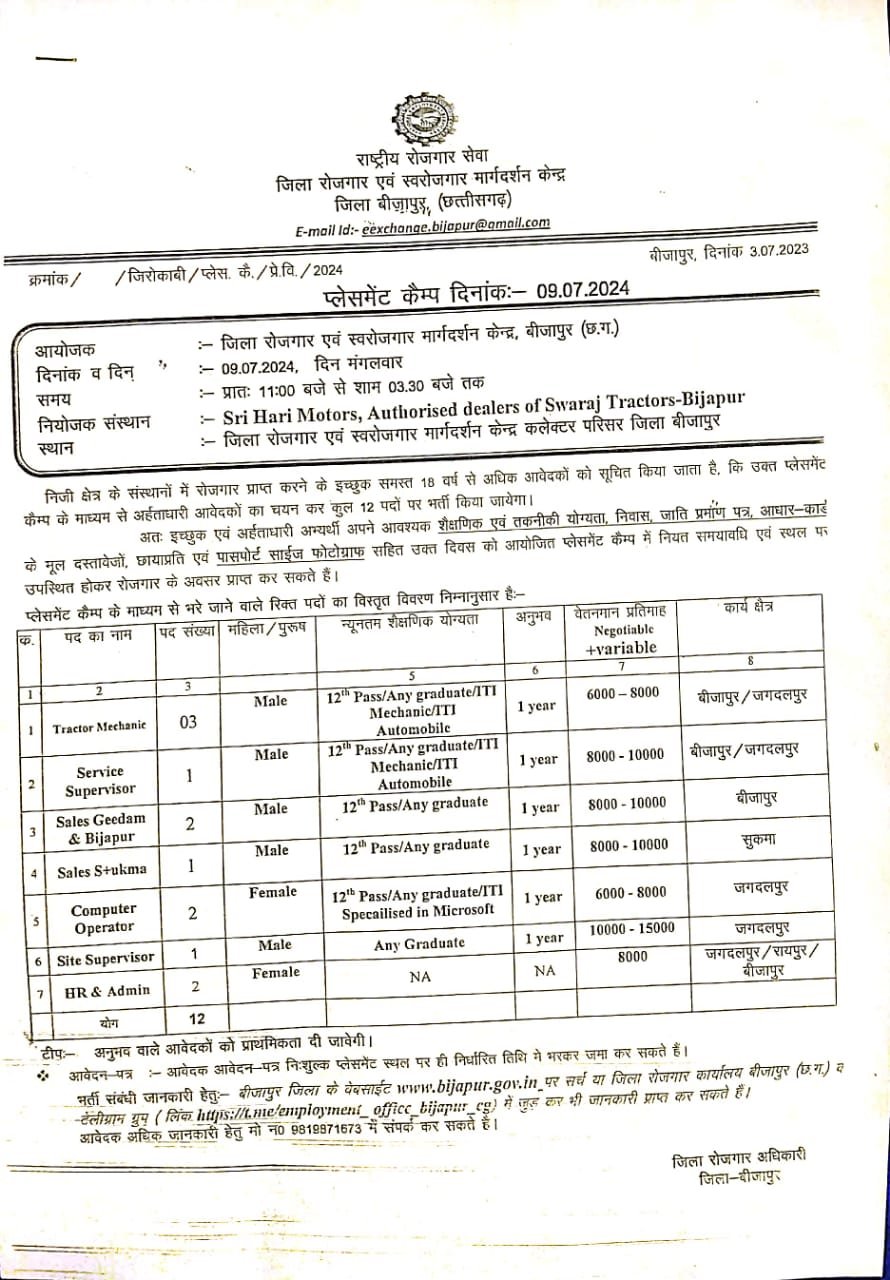 बीजापुर 08 जुलाई 2024- निजी क्षेत्र के संस्थानों में रोजगार प्राप्त करने के इच्छुक 18 वर्ष से अधिक आवेदकों को सूचित किया जाता है कि उक्त प्लेसमेंट कैम्प के माध्यम से अर्हताधारी आवेदकों का चयन कर कुल 12 पदों पर भर्ती किया जाएगा। इच्छुक युवा एवं युवती सम्पूर्ण दस्तावेजों के साथ कल 09 जुलाई 2024 को जिला कार्यालय में स्थित रोजगार एवं स्वरोजगार मार्गदर्शन केन्द्र बीजापुर में उपस्थित होकर प्लेसमेंट कैम्प में सम्मिलित हो सकते हैं। अधिक जानकारी के लिए जिले के वेबसाईट www.bijapur.gov.in पर या मोबाईल नम्बर 9819871673 पर सम्पर्क कर जानकारी प्राप्त कर सकते हैं।