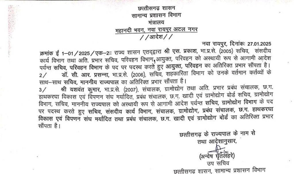 राज्य शासन ने प्रशासनिक व्यवस्था में बदलाव करते हुए 3 आईएएस अधिकारियों को नई जिम्मेदारियां सौंपी हैं। इस संबंध में आदेश जारी कर निम्नलिखित बदलाव किए गए हैं: