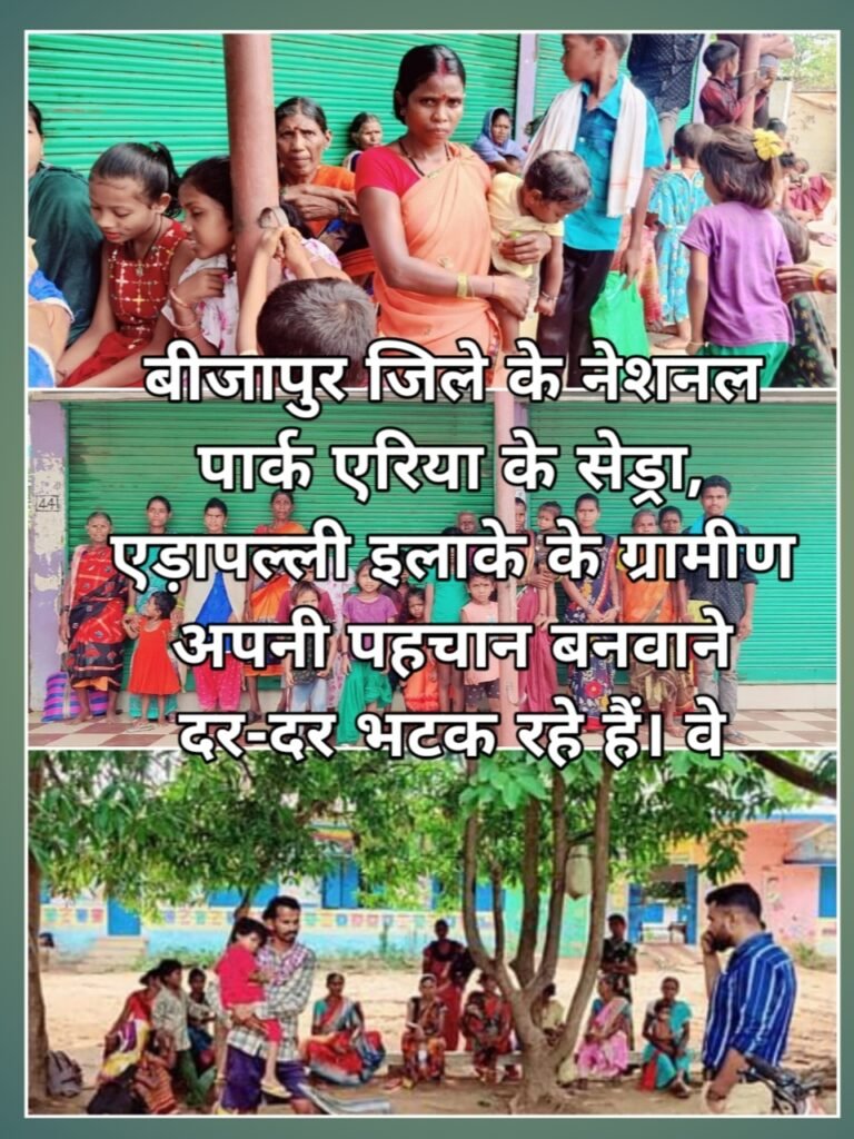 बीजापुर जिले के नेशनल पार्क एरिया के सेड्रा, एड़ापल्ली इलाके के ग्रामीण अपनी पहचान बनवाने दर-दर भटक रहे हैं। वे भोपालपटनम ब्लॉक मुख्यालय भी पहुंचे। उस इलाके में पदस्थ जिम्मेदार कर्मचारियों कि लापरवाही का नतीजा सैकड़ो ग्रामीण भुगत रहे हैं।