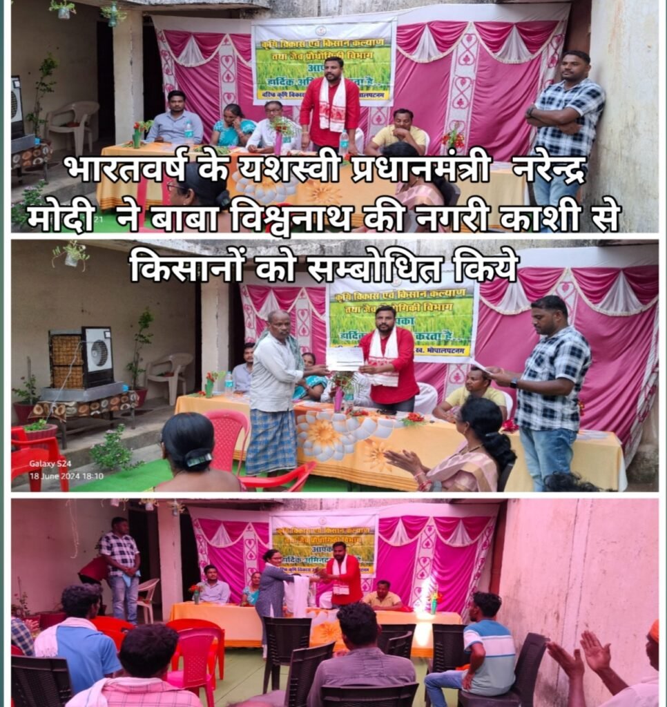 भोपालपटनम प्रधानमंत्री नरेंद्र मोदी के हस्तांतरण व्दारा किसान सम्मान निधि का सीधे किसानों के खातों में जमा ।भारतवर्ष के यशस्वी प्रधानमंत्री नरेन्द्र मोदी ने बाबा विश्वनाथ की नगरी काशी से किसानों को सम्बोधित किये पीएम किसान सम्मान निधि जिसकी वार्षिक देय राशि 6000₹ है।इस योजना की 17 वीं राशि सीधे किसानों के खातों में जमा किया गया है ।लगभग 9.25 लाख (नौ करोड़ पच्चीस लाख) किसान लाभान्वित हुए हैं । सभी किसानों मोदी अपने उद्बोधन टेलीविजन के माध्यम से सुने प्रधानमंत्री नयी योजना जो किसान महिलाओं के लिए है आशा कार्यकर्ताओं की तर्ज़ पर अब किसान महिला मित्र भी काम करेंगे ये भी लखपति बनने में अग्रसर रहेंगे।इस कार्यक्रम को कृषि विभाग के अधिकारियों के व्दारा आमंत्रण पर शामिल हुए वरिष्ठ भाजपा किसान नेता नीलम गणपत,महिला मोर्चा की अध्यक्षा रिंकी परस्ते ,भाजपा महामंत्री जीयल लक्ष्मीस्वामी और क्षेत्र के किसान बन्धु उपस्थित रहे ।इस कार्यक्रम के दौरान गिरिजाशंकर तामडी व्दारा किसानों को समझाया गया प्रधानमंत्री नरेंद्र मोदी की अनेकों जनकल्याणकारी योजनाओं से सभी लाभान्वित हो अंतिम व्यक्ति तक योजनाओं का लाभ मिलेगा ।आगे किसानों को सम्बोधित करते हुए कहा कि किसान अपनी बहुमूल्य उपजाऊ भूमि की परीक्षण करवायें माननीय प्रधानमंत्री नरेंद्र मोदी ने किसानों को पीएम मृदा परीक्षण योजना लाये जिसमें मृदा का परीक्षण कर किसानों को अपनी उपजाऊ भूमि पर कितनी मात्रा में रासायनिक एवं जैविक खाद का उपयोग करना ये जानकारी दी जाती है ।सारे किसान रासायनिक खाद की उपयोग मनमानी तारीके से ज़रूरत से ज़्यादा छिड़काव कर मृदा की प्रकृतिक शक्ति को ख़त्म कर रहे हैं ।उसे रोकना अनिवार्य है ताकि पर्यावरण भी सुरक्षित रहे और स्वस्थ्य भी सुरक्षित रहे।वर्षों से लम्बित मट्टीमरका में डैम का निर्माण कार्य के लिए किसानों संगठित होने को कहा ताकि क्षेत्र के किसानों को बारहमासी फसल उपज कर सकेंगे ।जल्द ही कृषक संगठन के व्दारा मुख्यमंत्री समक्ष आवेदन प्रस्तुत करेंगे ।