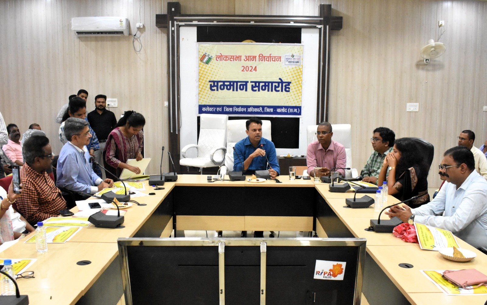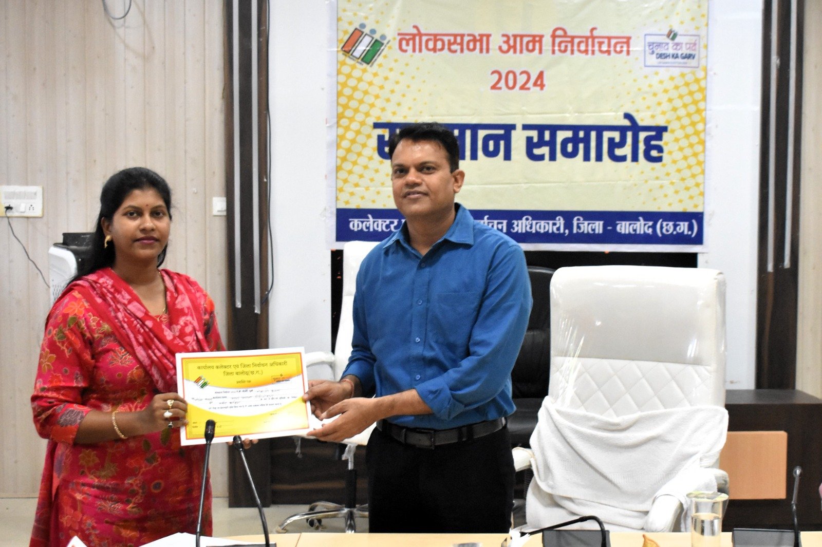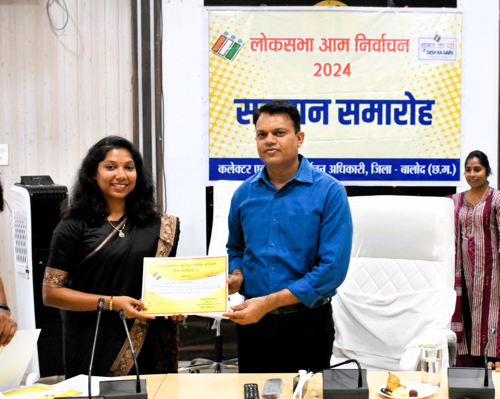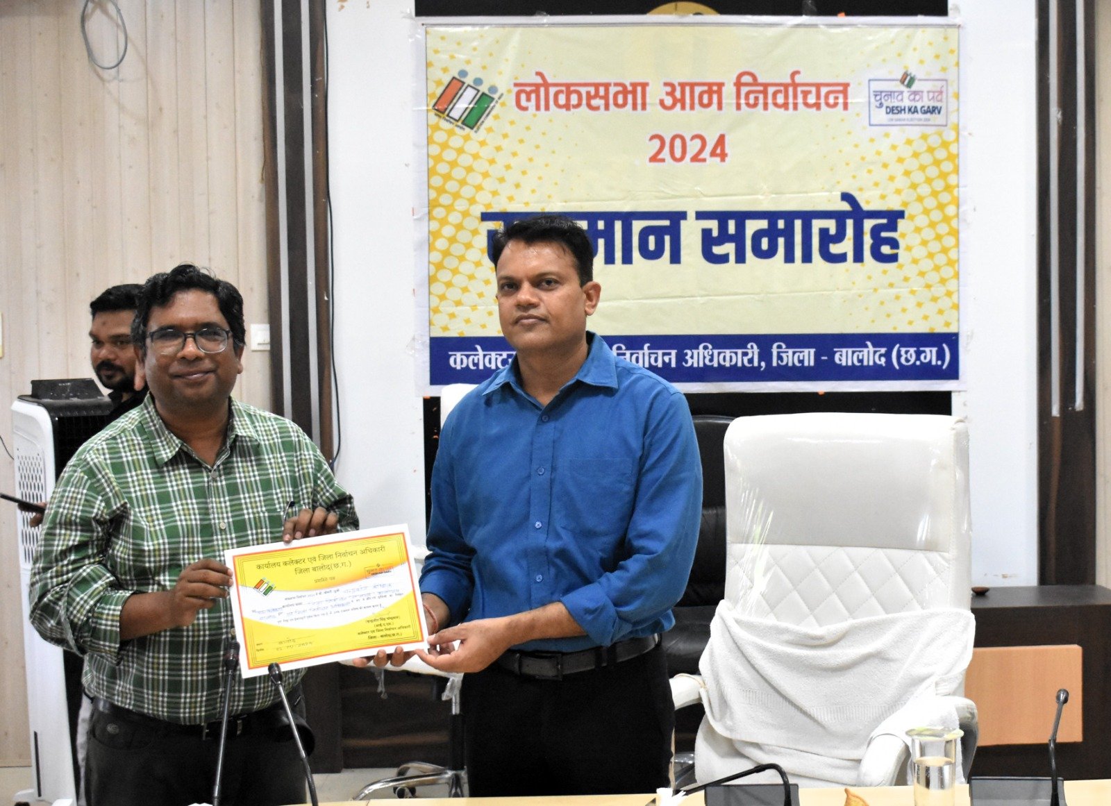 बालोद, कलेक्टर एवं जिला निर्वाचन अधिकारी इन्द्रजीत सिंह चन्द्रवाल ने लोकसभा आम निर्वाचन 2024 के अंतर्गत उत्कृष्ट कार्य संपादन के लिए उप जिला निर्वाचन अधिकारी चन्द्रकांत कौशिक सहित सहायक रिटर्निंग आॅफिसर एवं एसडीएम शीतल बंसल, शिवनाथ बघेल, सुरेश साहू सहित सभी नोडल एवं सहायक नोडल अधिकारी सहित जिला एवं विधानसभा स्तरीय मास्टर ट्रेनर्स, गणना सुपरवाईजर एवं गणना सहायकों को प्रशस्ति पत्र भेंटकर सम्मानित किया गया। इस अवसर पर कलेक्टर एवं जिला निर्वाचन अधिकारी श्री चन्द्रवाल ने सभी अधिकारी-कर्मचारियों के कार्यों की भूरी-भूरी सराहना करते हुए उन्हें हार्दिक बधाई एवं शुभकामनाएं दी। समारोह में जिला पंचायत के मुख्य कार्यपालन अधिकारी डाॅं. संजय कन्नौजे भी विशेष रूप से उपस्थित थे।