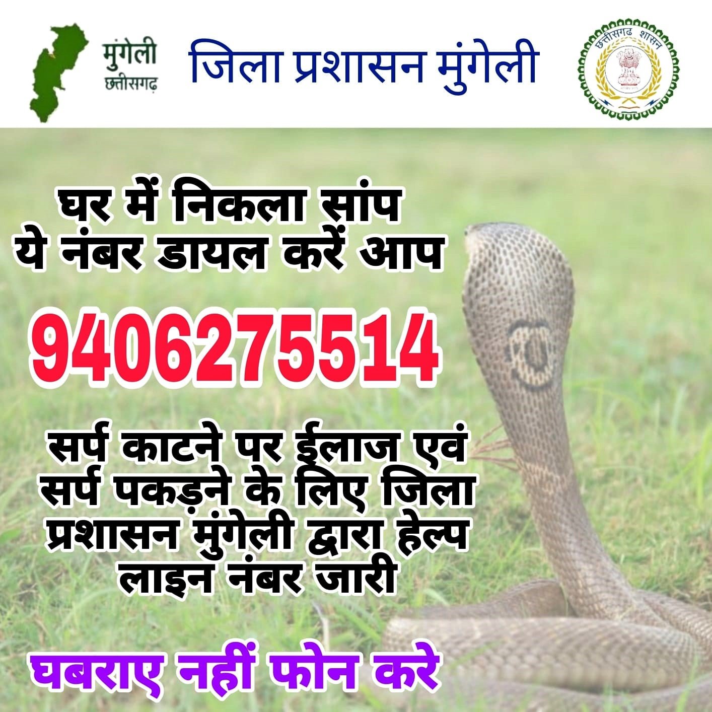 मुंगेली -कलेक्टर श्री राहुल देव के निर्देश पर जिले में बारिश के दिनों में घरों और आसपास निकलने वाले सर्प के रेस्क्यू एवं बाढ़ में फंसे लोगों के लिए हेल्पलाइन नंबर 9406275514 जारी किया गया है, जिसमें कॉल कर आवश्यक सहायता के लिए त्वरित जानकारी दे सकते हैं।