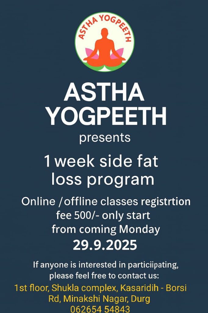दुर्ग। स्वास्थ्य और फिटनेस को ध्यान में रखते हुए Astha Yogpeeth एक विशेष 1 सप्ताह का साइड फैट लॉस प्रोग्राम लेकर आ रहा है। इस कार्यक्रम में प्रतिभागियों को ऑनलाइन और ऑफलाइन दोनों माध्यमों से क्लासेज दी जाएँगी।