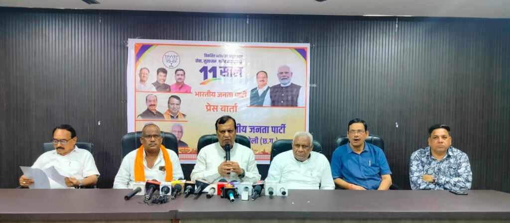 मुंगेली- प्रधानमंत्री नरेन्द्र मोदी के 11 वर्ष का शासनकाल संकल्प से सिद्धि तक की यात्रा को बड़ी ऐतिहासिक अभूतपूर्ण उपलब्धियों के साथ पूरा कर रहा है। ये बातें जिला भाजपा द्वारा प्रेसक्लब के कांफ्रेंस हाल में आयोजित पत्रवार्ता में प्रदेश भाजपा उपाध्यक्ष एवं भाटापारा के पूर्व विधायक शिवरतन शर्मा ने कही।