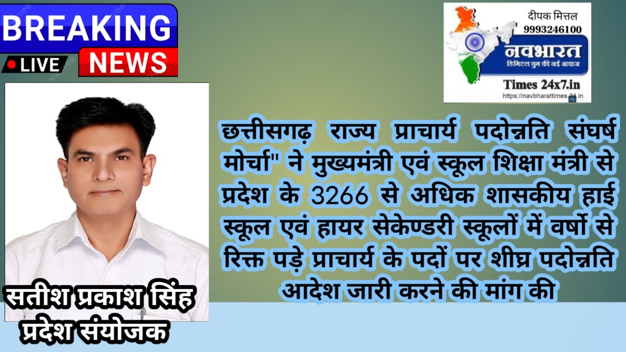 ईश्वर सिंह यादव (नवभारत टाइम्स 24X7.in) छत्तीसगढ़ राज्य प्राचार्य पदोन्नति संघर्ष मोर्चा” ने मुख्यमंत्री एवं स्कूल शिक्षा मंत्री से प्रदेश के 3266 से अधिक शासकीय