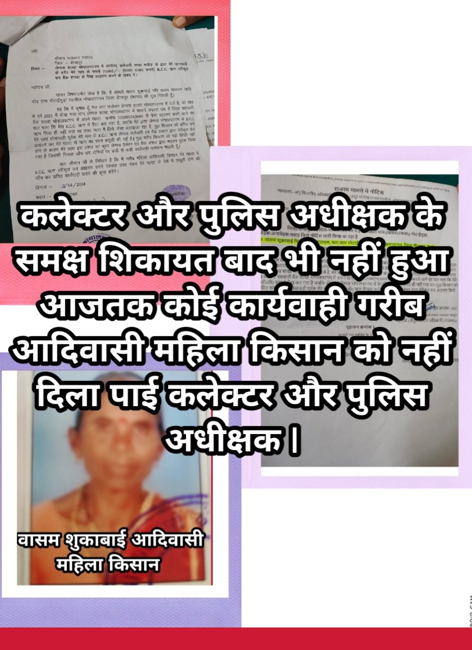 कलेक्टर और पुलिस अधीक्षक के समक्ष शिकायत बाद भी नहीं हुआ आजतक कोई कार्यवाही गरीब आदिवासी महिला किसान को न्याय नहीं दिला पाई कलेक्टर और