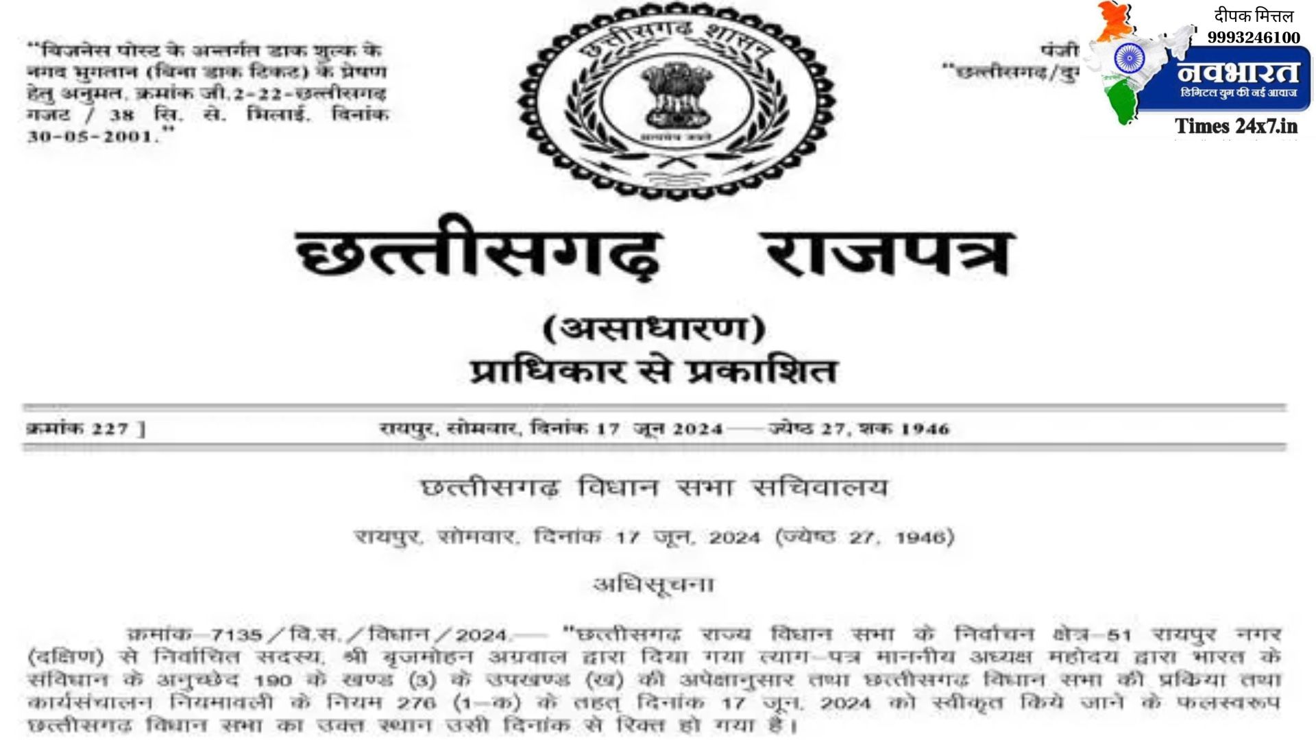रायपुर। विधायक बृजमोहन अग्रवाल के विधानसभा की सदस्यता से त्यागपत्र देने के साथ ही अधिसूचना जारी कर रायपुर दक्षिण सीट को रिक्त घोषित कर दिया गया