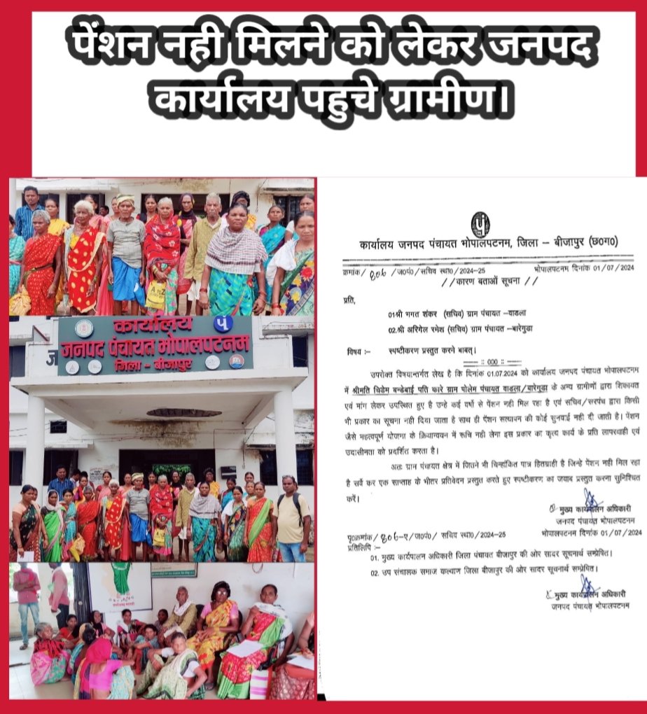 नवभारत टाइम्स जिला बीजापुर ब्यूरो प्रमुख जरखान 6263448923 पेंशन नही मिलने को लेकर जनपद कार्यालय पहुचे ग्रामीण। कई महीनों से नहीं मिल रहा पेंशन