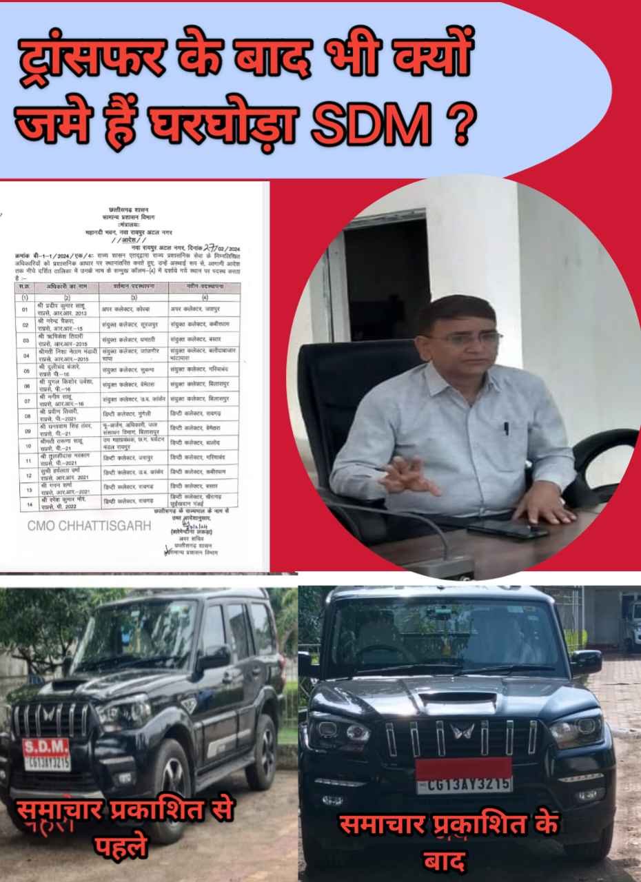 ट्रांसफर के बाद भी क्यों जमे हैं घरघोड़ा SDM ? शैलेश शर्मा 9406308437नवभारत टाइम्स 24×7.in जिला ब्यूरो रायगढ़ *किस आस-विशेष में टाली जा रही रिलीविंग