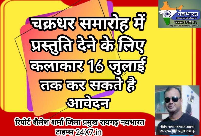 चक्रधर समारोह में प्रस्तुति देने के लिए कलाकार 16 जुलाई तक कर सकते है आवेदन शैलेश शर्मा 9406308437 नवभारत टाइम्स 24×7.in जिला ब्यूरो रायगढ़ रायगढ़,