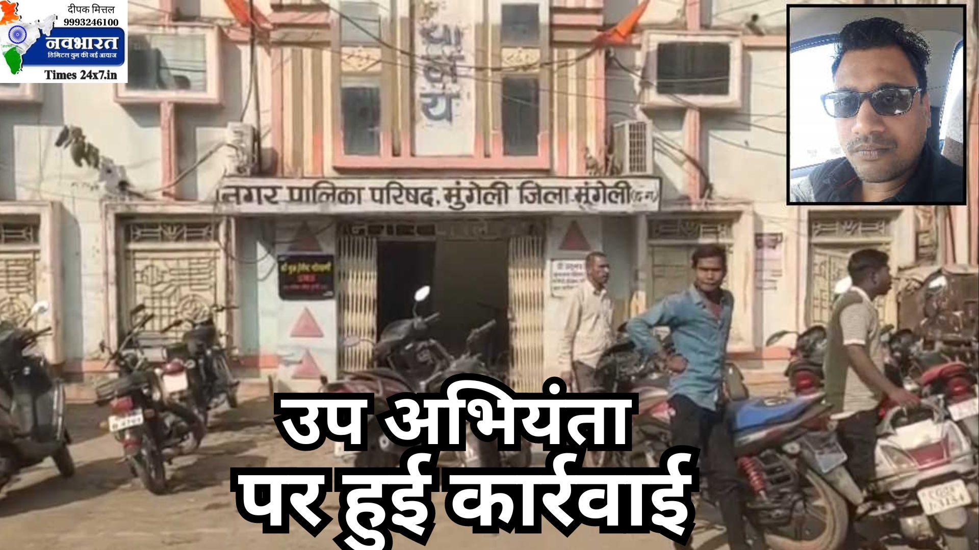मुंगेली –मुंगेली नगर पालिका के उप अभियंता दीपक कुमार देवांगन को कलेक्टर श्री राहुल देव ने आदेश जारी कर तत्काल प्रभाव से निलंबित कर दिया
