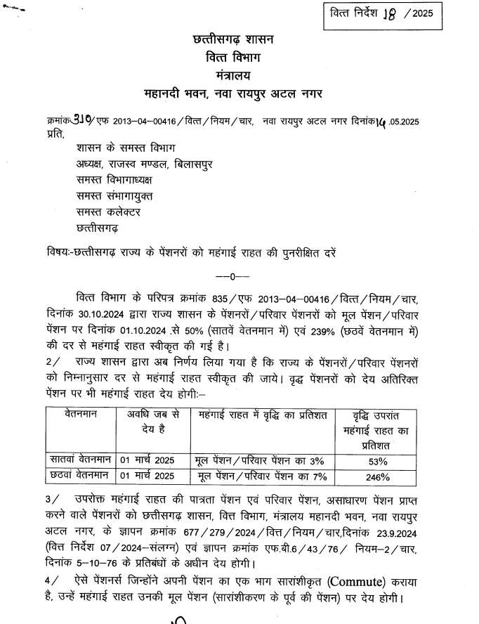 छत्तीसगढ़ के पेंशनरों के लिए बड़ी खुशखबरी सामने आई है। साय सरकार ने राज्य के पेंशनरों की महंगाई राहत की दर में वृद्धि का आदेश