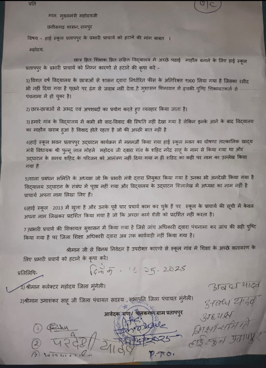 निर्मल अग्रवाल ब्यूरो प्रमुख मुंगेली 8959931111 मुंगेली- शासकीय हाई स्कूल प्रतापपुर के प्रभारी प्राचार्य मेघनाथ कोसरिया का सुशासन में गंभीर शिकायत हुआ है। जिसमें 2024