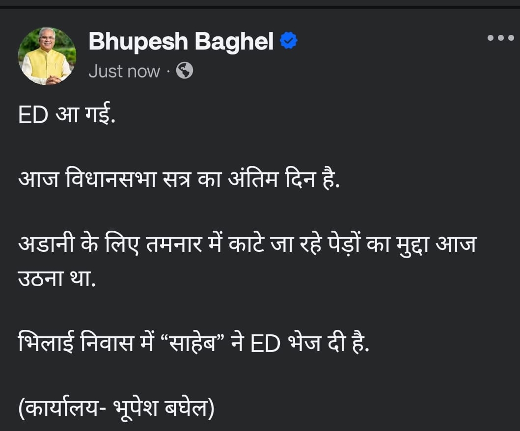 प्रवर्तन निदेशालय (ईडी) ने आज सुबह पूर्व मुख्यमंत्री भूपेश बघेल के निवास पर छापेमारी की है। ईडी की टीम भिलाई स्थित भूपेश बघेल के निजी