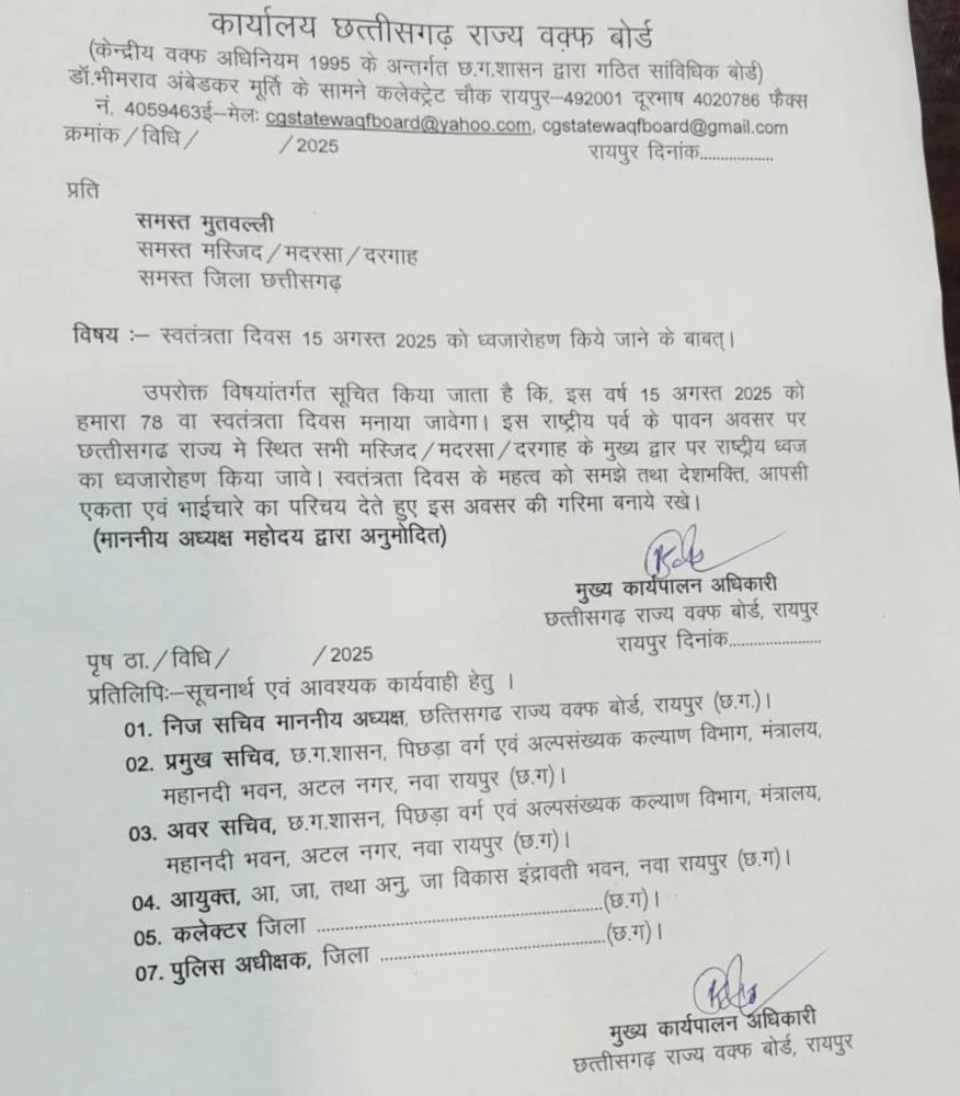रायपुर। स्वतंत्रता दिवस के अवसर पर छत्तीसगढ़ राज्य वक्फ बोर्ड ने राज्यभर की सभी मस्जिदों, मदरसों और दरगाहों में राष्ट्रीय ध्वज फहराने का आग्रह किया