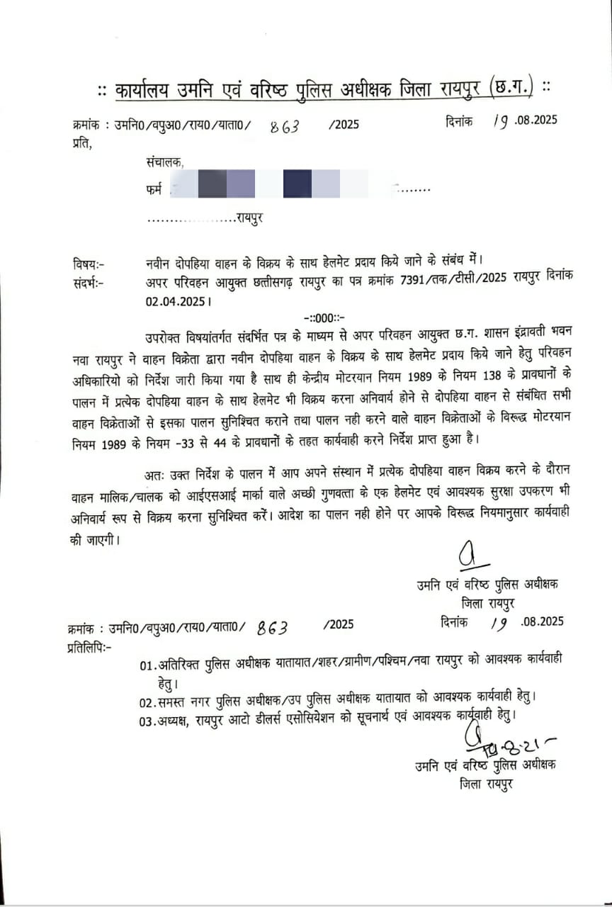 रायपुर। सड़क हादसों में लगातार बढ़ रही मौतों को देखते हुए पुलिस ने बड़ा निर्णय लिया है। एसएसपी डॉ. लाल उमेद सिंह ने आदेश