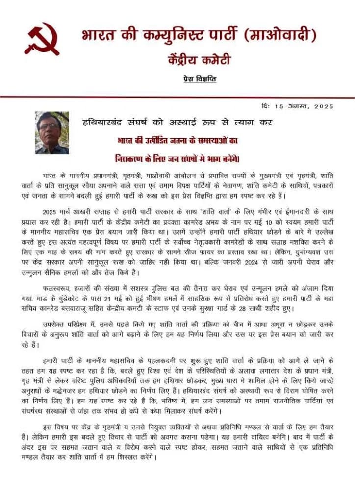 नक्सली संगठन की केंद्रीय समिति ने स्पष्ट किया है कि वरिष्ठ माओवादी नेता सोनू का युद्धविराम बयान उनकी व्यक्तिगत राय है, न कि पार्टी का