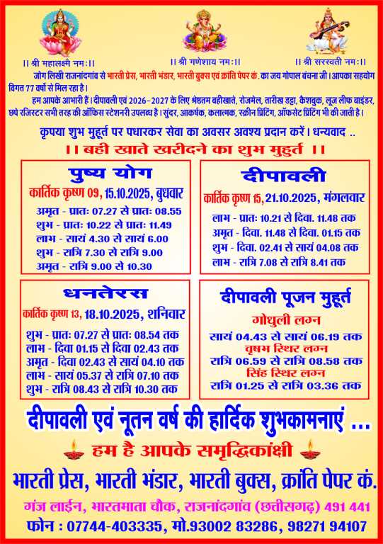 राजनांदगांव।राजनांदगांव स्थित भारती प्रेस, भारती भंडार, भारती बुक्स एवं क्रांति पेपर कंपनी ने आगामी दीपावली पर्व 2025 के लिए शुभ मुहूर्त और त्योहार से जुड़े