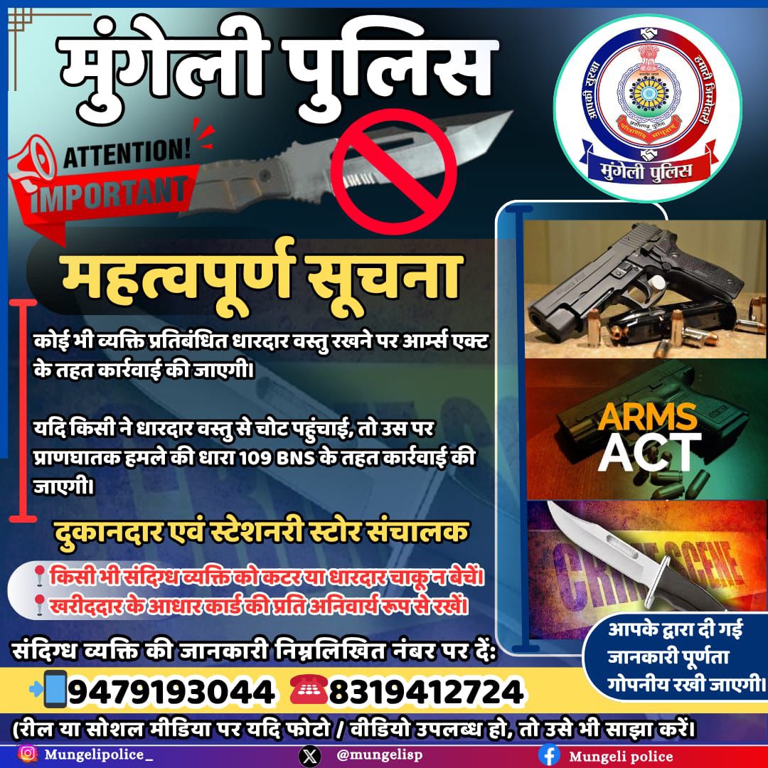 निर्मल अग्रवाल ब्यूरो प्रमुख मुंगेली 8959931111 मुंगेली, 26 अक्टूबर 2025: मुंगेली पुलिस ने जिले के सभी नागरिकों से अपील की है कि वे किसी भी