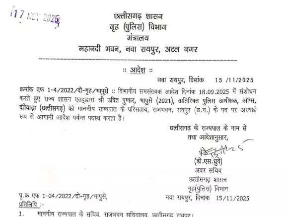 रायपुर: बस्तर के दंतेवाड़ा में नक्सल आपरेशन में तैनात आईपीएस उदित पुष्कर (2021 बैच) को अब राज्यपाल के नए एडीसी के रूप में नियुक्त किया गया है। यह नई नियुक्ति