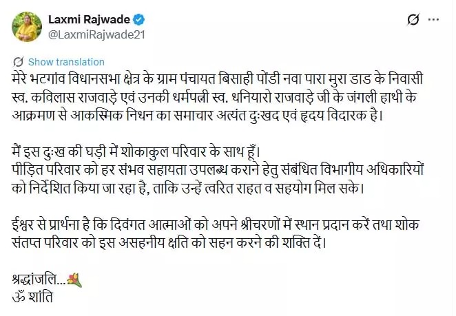 भटगांव: राजवाड़े दंपति के जंगली हाथी के आक्रमण में आकस्मिक निधन के मामले में मंत्री लक्ष्मी राजवाड़े ने गहरी संवेदना व्यक्त की है। उन्होंने कहा कि उनके भटगांव