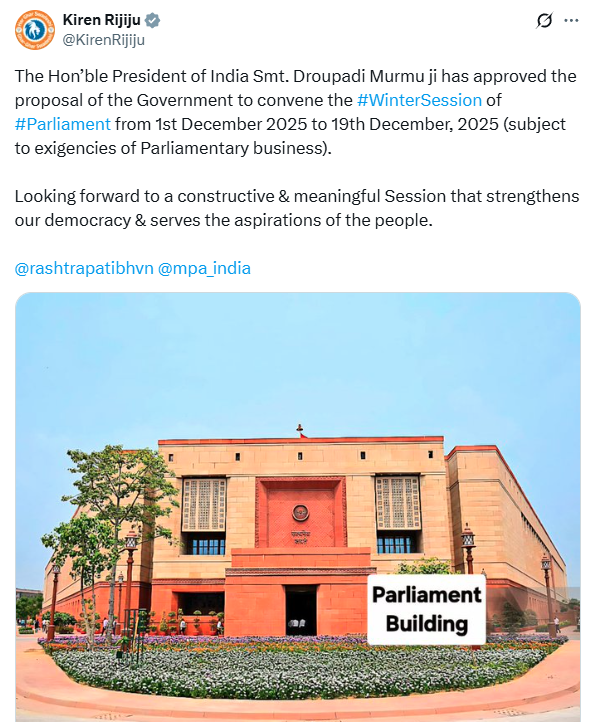 केंद्रीय संसदीय कार्य मंत्री किरेन रिजिजू ने सोशल मीडिया प्लेटफॉर्म एक्स पर जानकारी दी है कि राष्ट्रपति द्रौपदी मुर्मू ने संसद के शीतकालीन सत्र बुलाने