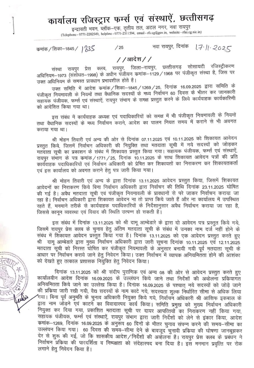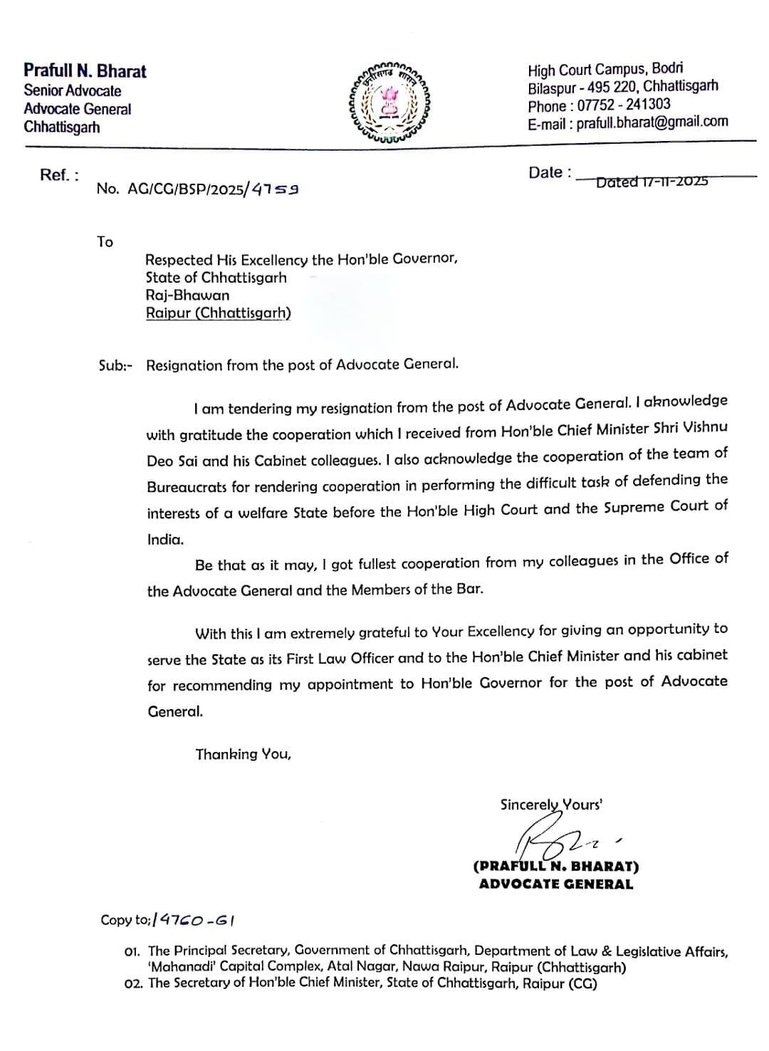 BIG BREAKING: छत्तीसगढ़ के महाधिवक्ता प्रफुल्ल भारत ने दिया इस्तीफा— राज्यपाल को भेजा त्यागपत्र, मुख्यमंत्री और सहयोगियों का किया धन्यवाद बिलासपुर।छत्तीसगढ़ के महाधिवक्ता (Advocate General) प्रफुल्ल