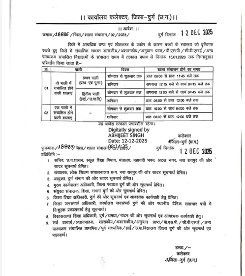 जिले सहित पूरे प्रदेश में कड़ाके की ठंड और शीतलहर को देखते हुए स्कूलों के समय में बदलाव किया गया है। दुर्ग कलेक्टर ने शनिवार