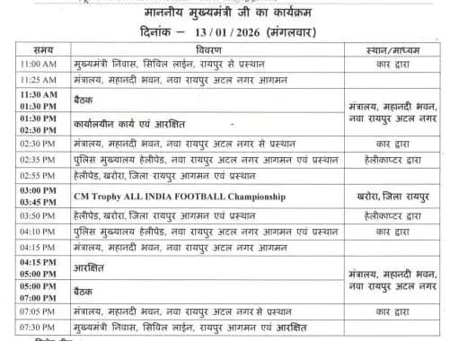 रायपुर: मुख्यमंत्री विष्णुदेव साय आज राजधानी रायपुर में आयोजित विभिन्न कार्यक्रमों में शामिल होंगे। निर्धारित कार्यक्रम के अनुसार वे सुबह 11 बजे मंत्रालय पहुंचेंगे, जहां