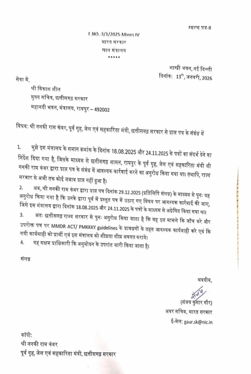 भाजपा के वरिष्ठ आदिवासी नेता और छत्तीसगढ़ के पूर्व गृहमंत्री ननकी राम कंवर की शिकायत पर कार्रवाई न होने से केंद्र सरकार ने कड़ी नाराजगी