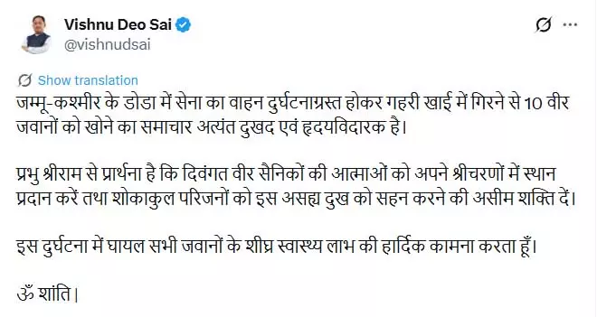 रायपुर: जम्मू-कश्मीर के डोडा जिले में सेना का वाहन गहरी खाई में गिरने से हुए दर्दनाक हादसे पर मुख्यमंत्री विष्णु देव साय ने गहरा शोक व्यक्त