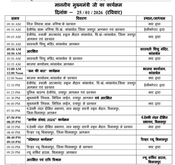 रायपुर: मुख्यमंत्री विष्णुदेव साय आज जशपुर और बिलासपुर के कई कार्यक्रमों में शामिल होंगे. वे सुबह 11 बीजेपी कार्यालय कांसाबेला में “मन की बात”