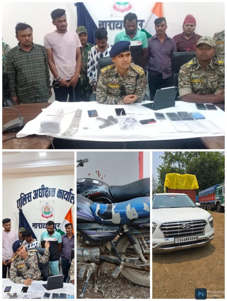 नाम आरोपी -1- विश्वजीत नाग पिता हाराधन नाग जाति कायस्थ (बंगाली) उम्र 48 वर्ष साकिन 66 नं. बेलघड़िया थाना बेलघड़िया जिला कलकत्ता (पं.ब.) हाल मुकाम बंगलापारा, मनीष राठौर का गोदाम, नारायणपुर 2- संदीप यादव उर्फ संजू पिता अरूण यादव उम्र 24 वर्ष साकिन सुभाष चैक देहान (गौठान के पास) बोरसी थाना पद्मनाभपुर जिला दुर्ग (छ.ग.), 3- राजीव रंजन यति उर्फ राजू उर्फ बिहारी पिता हीरा लाल यति जाति गोसाई (ब्राम्हण) उम्र 41 वर्ष सा. पिपरा थाना मीरगंज जिला गोपालगंज (बिहार) हाल मुकाम- रूट नं. 11 ब्लाॅक नं. 09 रूम नं. 11, सेक्टर 09 हाॅस्पिटल सेक्टर, थाना कोतवाली, सेक्टर – 06 जिला दुर्ग (छ.ग.) 4- आर. सैमुआल उर्फ रायनुन्तलम पिता स्व. आर. सी. रत्नम जाति इसाई (तेलगु) उम्र 39 वर्ष साकिन सड़क नं. 09 ब्लाॅक नं. 01 रूम नं. 06 हास्पिटल सेक्टर 09 थाना कोतवाली सेक्टर 06 जिला दुर्ग (छ.ग.) 5- जसप्रीत सिंह उर्फ पोतू पिता स्व. सरदारा सिंह जाति सिक्ख उम्र 20 वर्ष साकिन खालसा बिला, बंगलापारा नारायणपुर थाना व जिला नारायणपुर 6- विवेक अधिकारी उर्फ सिदाम पिता हरविलास उम्र 28 वर्ष जाति नमोशूद्र साकिन बखरूपारा नारायणपुर।