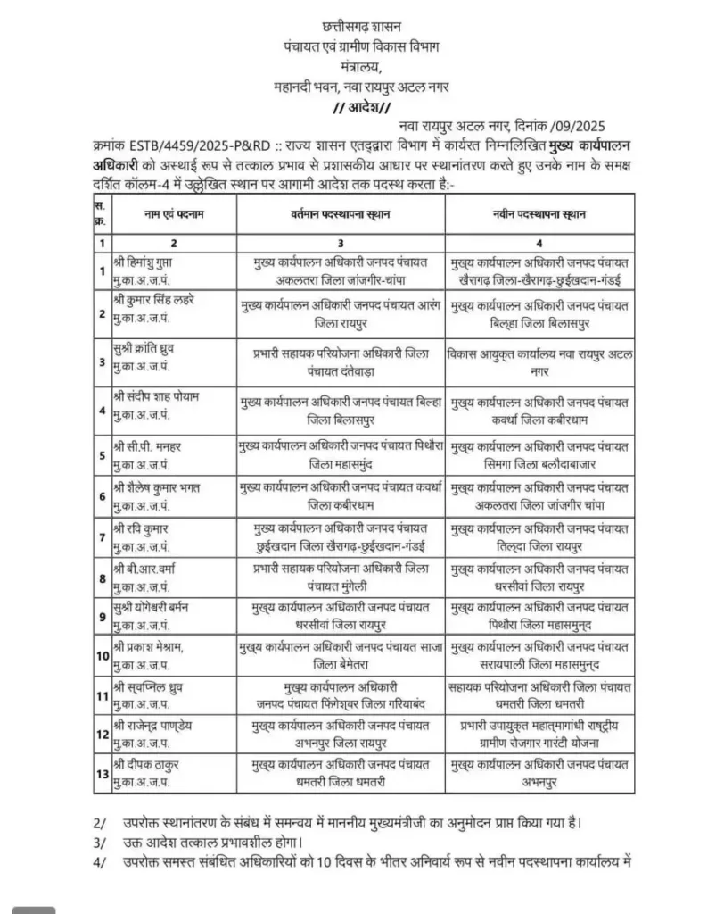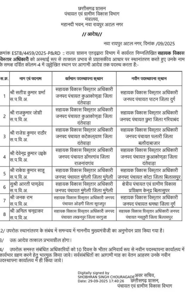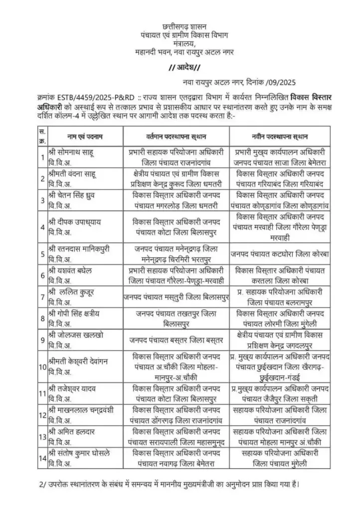 छत्तीसगढ़ के ग्रामीण एवं विकास विभाग में बड़े पैमाने पर तबादला किया गया है।